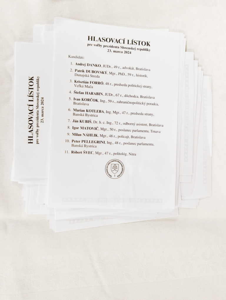 Hlasovacie lístky počas prípravy volebnej miestnosti v Starej Turej v rámci 1. kola prezidentských volieb 2024. Stará Turá, 23. marec 2024. Foto: SITA/Martin Medňanský.
