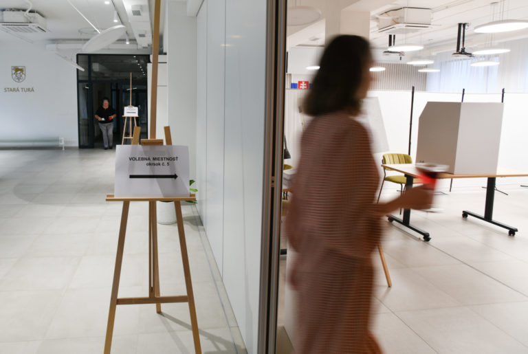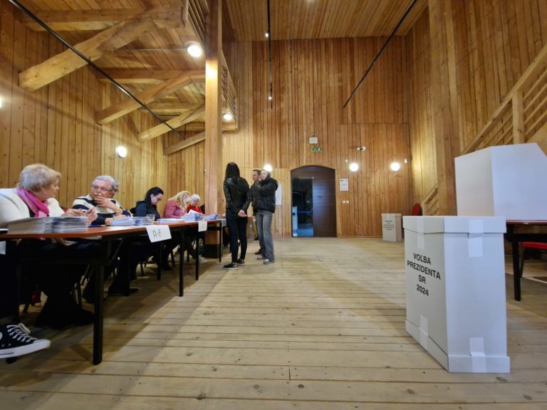 Priebeh volieb vo volebnej miestnosti v mestskom úrade v Starej Turej počas 1. kola prezidentských volieb 2024. Stará Turá, 23. marec 2024. Foto: SITA/Martin Medňanský.