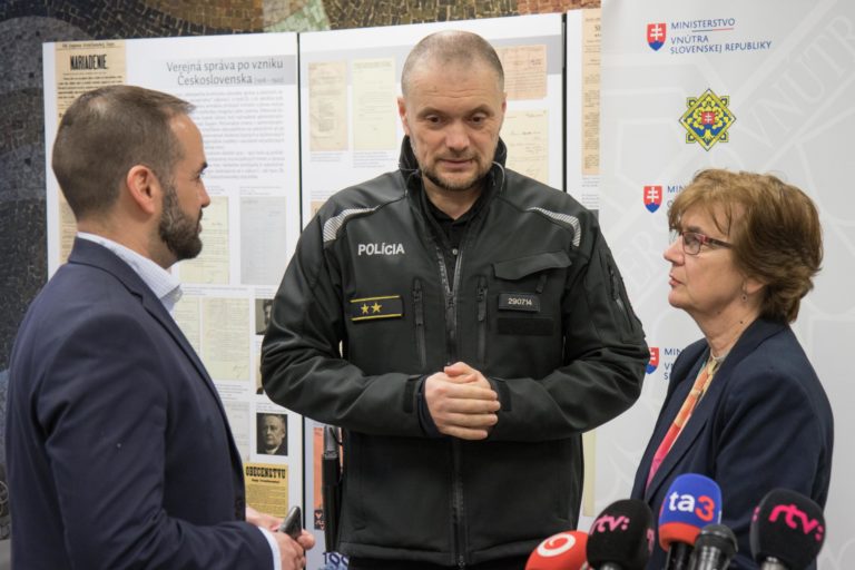Zľava: Hovorca MV SR Matej Neumann, riaditeľ poriadkovej polície PZ SR Stanislav Hromádka a riaditeľka odboru volieb na MV SR Eva Chmelová počas tlačovej konferencie Štátnej komisie pre voľby a kontrolu financovania politických strán v rámci 1. kola prezidentských volieb 2024. Bratislava, 23. marec 2024. Foto: SITA/Ľudovít Vaniher.