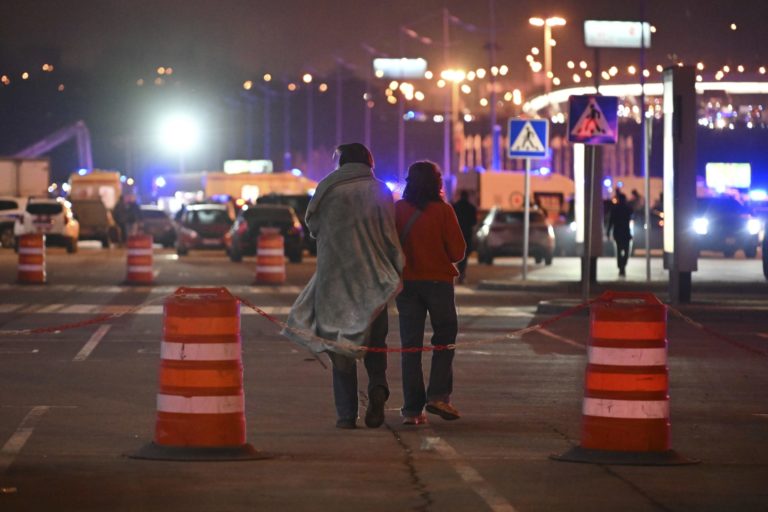 Ruská polícia blokuje cestu ku Crocus City Hall, kde ozbrojenci v piatok vtrhli do koncertnej siene a spustili tam paľbu z automatických zbraní do ľudí prichádzajúcich na koncert. Útočníci použili aj výbušniny a v budove spôsobili požiar. Podľa ruskej Federálnej bezpečnostnej služby (FSB) si útok vyžiadal najmenej 40 mŕtvych a viac ako 100 zranených. Moskva, 22. marec 2024. Foto: SITA/AP.