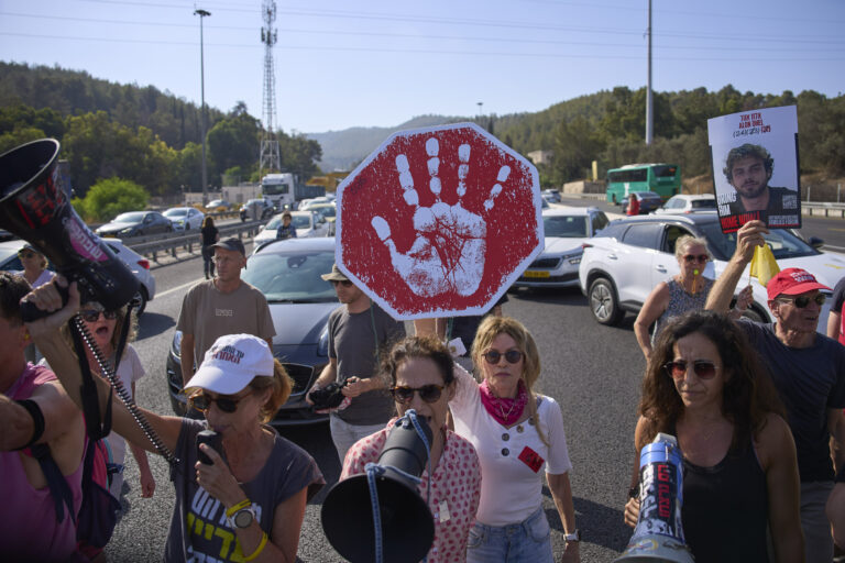 Demonštranti blokujú diaľnicu počas protestu, na ktorom požadujú okamžité prepustenie rukojemníkov držaných Hamasom a vyzývajú izraelskú vládu, aby zrušila svoje rozhodnutie o prevzatí kontroly nad mestom Gaza a ďalšími oblasťami v pásme Gazy neďaleko Bet Šemešu. Izrael, 24. augusta 2025. Foto: (AP Photo/Ohad Zwigenberg)
