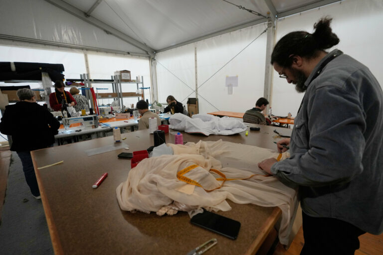 Krajčíri pracujú na oblečení počas skúšok otváracieho ceremoniálu zimných olympijských hier Miláno Cortina 2026 v areáli vo veľkom stane vedľa štadióna San Siro v Miláne. Taliansko, 24. januára 2026. Foto: AP Photo/Luca Bruno