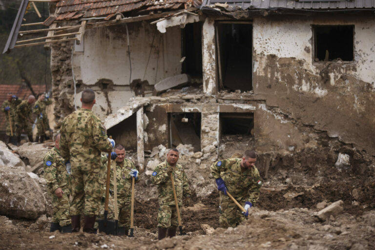 Maďarskí vojaci slúžiaci v misii Eufor čistia miesto v Bosne, ktoré nedávno zasiahli povodne a zosuvy pôdy. Jablanica, 24. október 2024. Foto: SITA/AP
