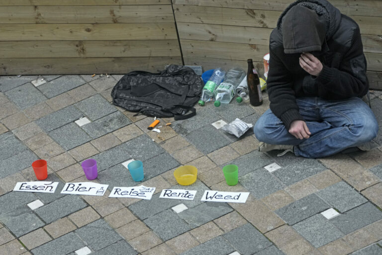 Mladý muž v Nemecku žobre o peniaze na jedlo, pivo, cestovanie, dôchodok a "trávu". Dortmund, 24. október 2024. Foto: SITA/AP