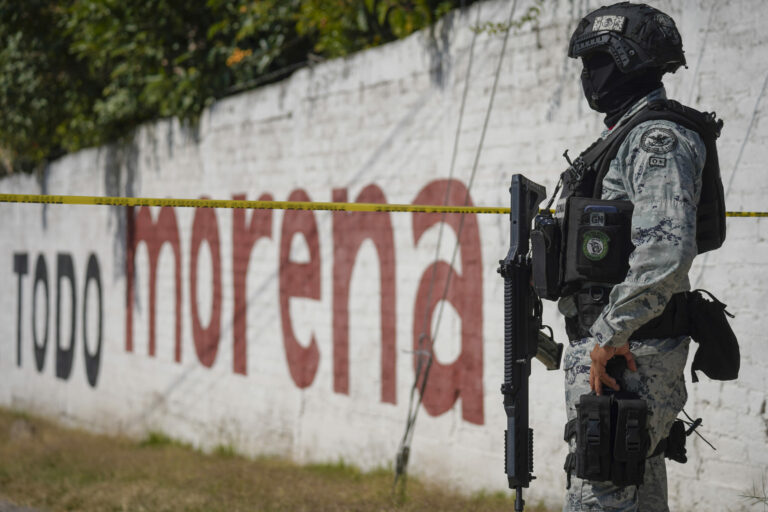 Príslušník mexickej národnej gardy hliadkuje neďaleko miesta, kde pri policajnej stanici v , štáte Guanajuato vybuchla bomba v aute. Acambaro, 24. október 2024. Foto: SITA/AP
