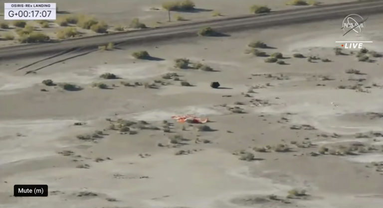 Schránka so vzorkami prachu a hornín, ktoré americká sonda OSIRIS-REx nabrala v roku 2020 na planétke Bennu, v nedeľu po sedemročnej misii úspešne pristála na Zemi. Foto: NASA TV via AP.