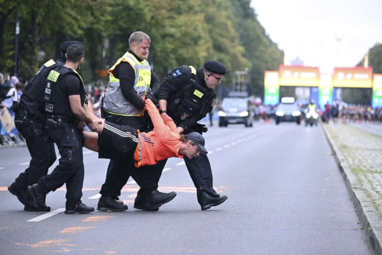 Berlínsky maratón narušili aktivisti, ktorí na cestu vyliali oranžovú farbu, aby protestovali proti klimatickej politike nemeckej vlády. Foto: Sebastian Christoph Gollnow/dpa via AP.