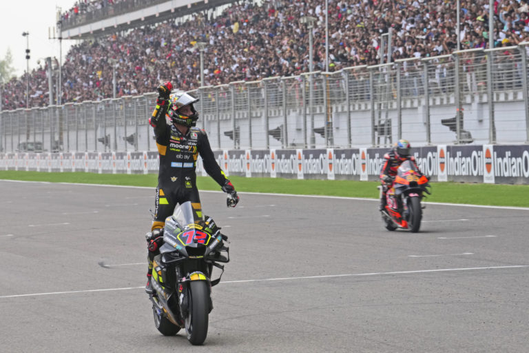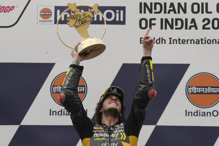 Jazdec talianskeho tímu Mooney VR46 Racing Team (Ducati), Marco Bezzecchi sa teší z triumfe na VC Indie v triede MotoGP. Foto: SITA/AP.