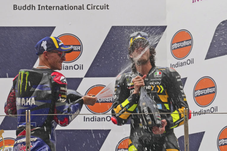 Jazdec talianskeho tímu Mooney VR46 Racing Team (Ducati), Marco Bezzecchi (vpravo) sa teší z triumfe na VC Indie v triede MotoGP. Foto: SITA/AP.