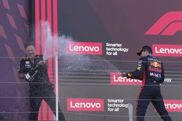 Šéf tímu Red Bull Christian Horner (vľavo) a Max Verstappen na stupňoch pre víťazov po Veľkej cene Japonska na okruhu v Suzuke. Foto: SITA/AP.