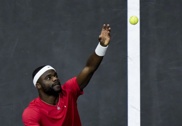 Člen tímu sveta Frances Tiafoe počas zápasu proti Hubertovi Hurkaczovi z tímu Európy na Laver Cupe vo Vancouveri. Foto: Darryl Dyck/The Canadian Press via AP.