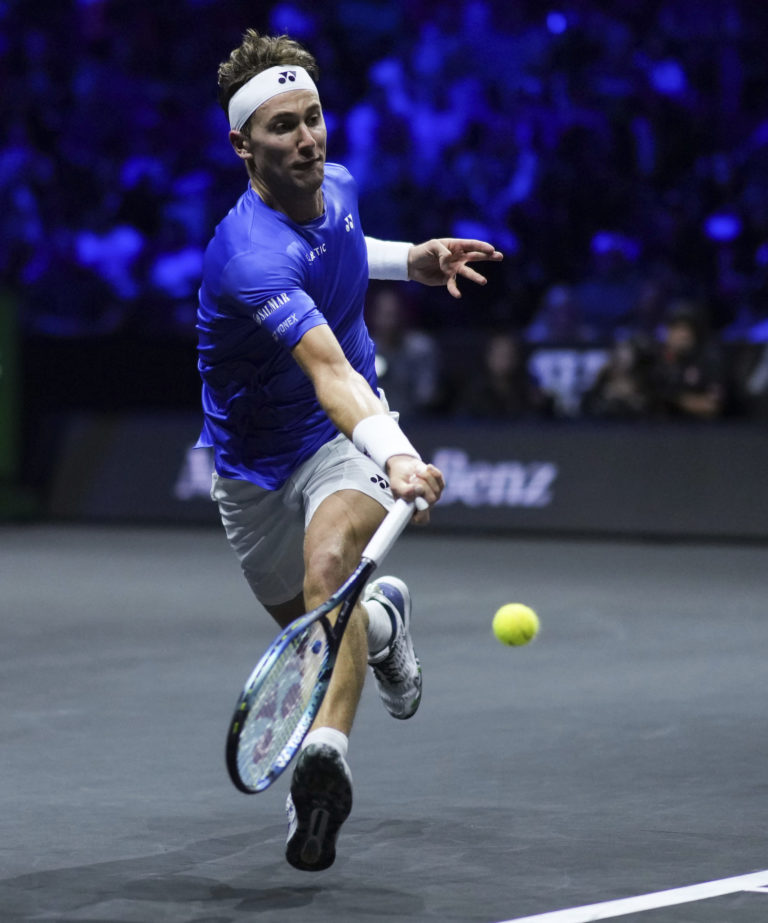 Casper Ruud z tímu Európy počas zápasu proti Tommymu Paulovi z tímu sveta na Laver Cupe vo Vancouveri. Foto: Darryl Dyck/The Canadian Press via AP.