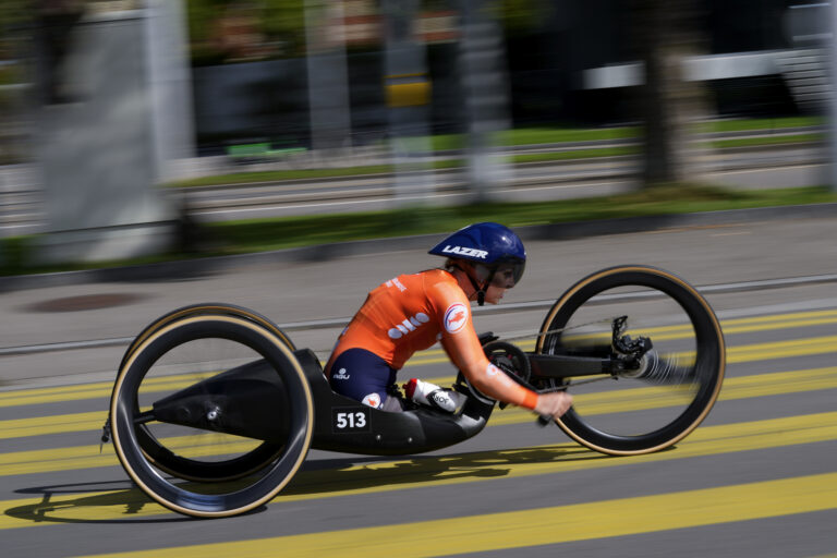 Chantal Haenen z Holandska súťaží v časovke jednotlivcov v paracyklistike na majstrovstvách sveta v cestnej cyklistike vo Švajčiarsku. Zürich, 24. september 2024. Foto: SITA/AP