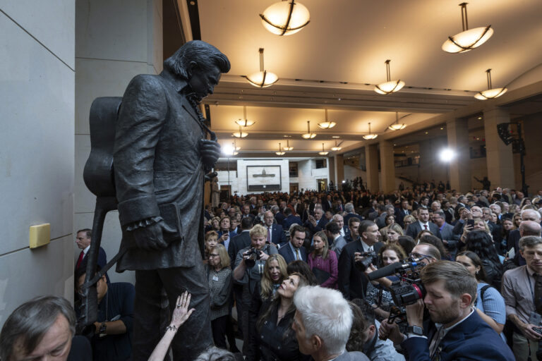 Dav ľudí okolo bronzovej sochy legendárneho amerického speváka Johnnyho Casha, ktorú odhalili v Emancipation Hall v Kapitole. Washington, 24. september 2024. Foto: SITA/AP