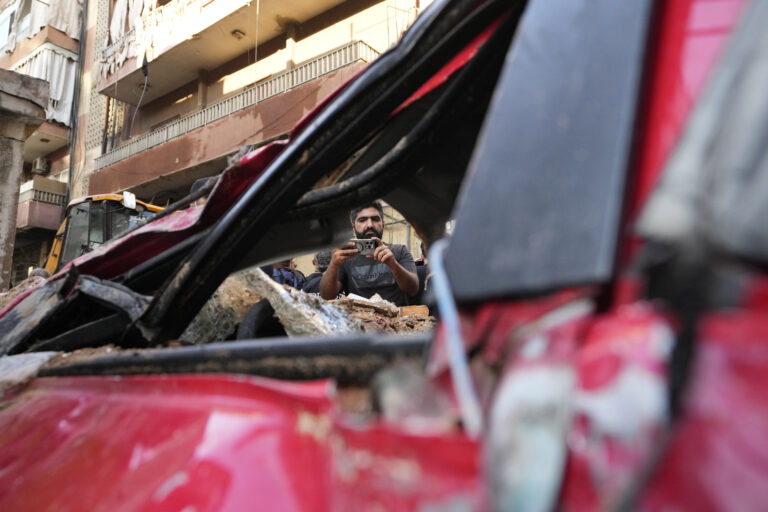 Muž si fotí zničené auto na mieste zasiahnutom izraelským náletom v Libanone. Bejrút, 24. september 2024. Foto: SITA/AP