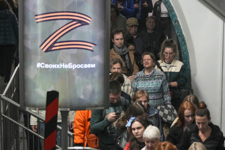 Ruský symbol vojny proti Ukrajine, písmeno Z, popri ktorom prechádzajú ľudia v metre. Petrohrad, 24. september 2024. Foto: SITA/AP