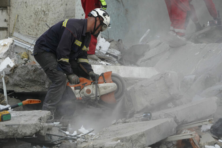 Ukrajinský záchranár píli kusy betónu v troskách obytnej budovy počas záchranárskych prác po ruskom leteckom útoku. Charkov, 24. september 2024. Foto: SITA/AP