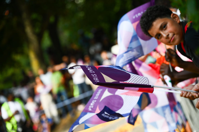 Atmosféra v parku v miestnej časti Nanterre v Paríži počas prechodu štafetového behu s pochodňou s olympijským ohňom pred začiatkom XXXIII. letných olympijských hier 2024 v Paríži. Paríž, 24. júl 2024. Foto: SITA/Martin Medňanský