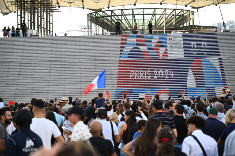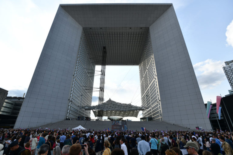 Atmosféra pred Veľkým oblúkom v časti La Defense v Paríži počas prechodu štafetového behu s pochodňou s olympijským ohňom pred začiatkom XXXIII. letných olympijských hier 2024 v Paríži. Paríž, 24. júl 2024. Foto: SITA/Martin Medňanský