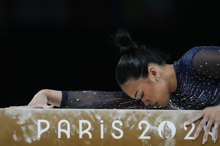 Suni Lee zo Spojených štátov počas gymnastického tréningu v Bercy Arene na Letných olympijských hrách 2024 vo štvrtok 25. júla 2024 v Paríži vo Francúzsku. Foto: SITA/AP