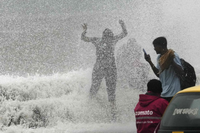 Ľudia sú zaplavení vlnami prílivu na Marine Drive na pobreží Arabského mora v Bombaji v Indii, štvrtok 25. júla 2024. Foto: SITA/AP