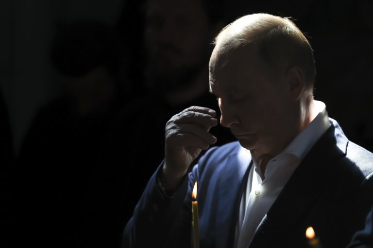Ruský prezident Vladimir Putin sa prežehnáva pri návšteve kláštora Spaso-Preobraženskij Valaam s bieloruským prezidentom Alexandrom Lukašenkom na ostrove Valaam v Ladožskom jazere, Karélia, Rusko, štvrtok, 25. júla 2024. Foto: Alexander Kazakov, Sputnik, Kremlin Pool Photo via AP