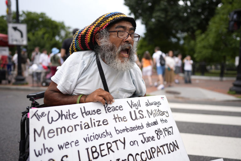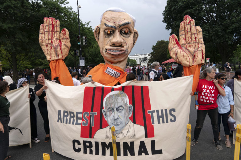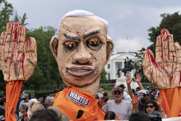 Demonštranti protestujú pred Bielym domom proti návšteve izraelského premiéra Benjamina Netanjahua v Bielom dome počas zhromaždenia v Lafayette Parku vo štvrtok 25. júla 2024 vo Washingtone. Foto: SITA/AP