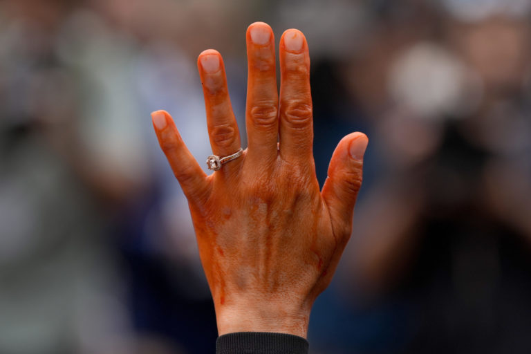 Demonštrantka dvíha ruku zafarbenú červenou tekutinou, zatiaľ čo chasidskí Židia a ďalší protestujú proti politike izraelského premiéra Benjamina Netanjahua neďaleko Kapitolu USA počas plánovanej návštevy Netanjahua vo štvrtok 25. júla 2024 vo Washingtone. Foto: SITA/AP