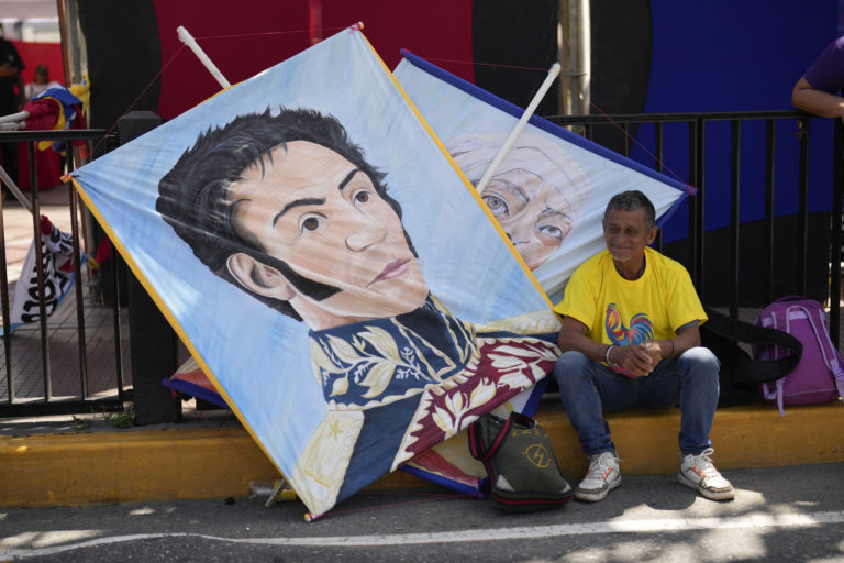 Priaznivec venezuelského prezidenta Nicolasa Madura sedí vedľa plagátu hrdinu venezuelskej nezávislosti Simona Bolívara, ktorý čaká na začiatok Madurovej predvolebnej kampane v Caracase, Venezuela, štvrtok 25. júla 2024. Foto: SITA/AP
