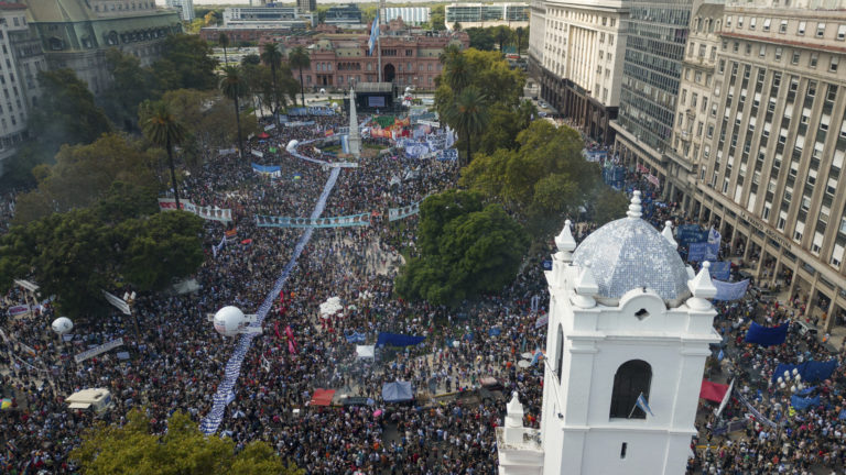 Demonštranti ukazujú transparent s fotografiami ľudí, ktorí zmizli počas vojenskej diktatúry v rokoch 1976-1983. Foto: SITA/AP