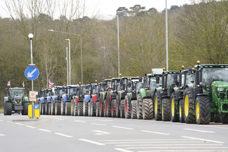 Kolóna farmárov na traktoroch na diaľnici A20 pri Wrothame v anglickom Kente. Foto: Gareth Fuller/PA via AP