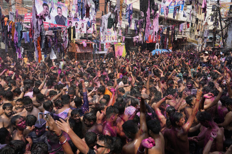Účastníci osláv s tvárami od farebného prášku tancujú počas osláv hinduistického sviatku farieb Holi. Foto: SITA/AP