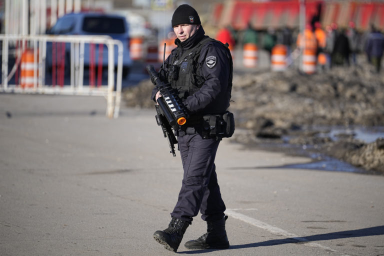 Policajt stojí na stráži s protidronovou puškou na predmestí Moskvy. Foto: SITA/AP