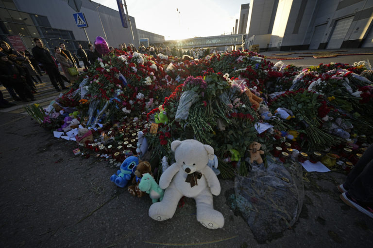 Hračky a kvety na provizórnom pamätníku pred radnicou Crocus na západnom okraji Moskvy. Foto: SITA/AP