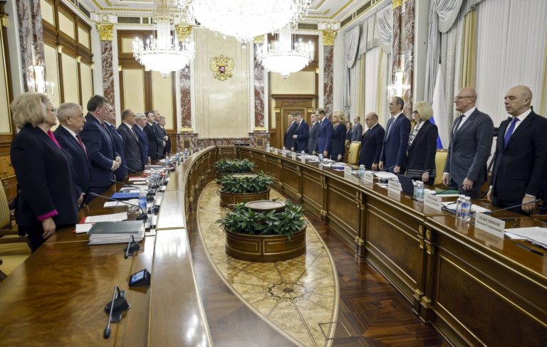 Ruský premiér Michail Mišustin s členmi vlády a zástupcami frakcie Komunistickej strany Ruska v dolnej komore parlamentu. Foto: Dmitry Astakhov, Sputnik, Government Pool Photo via AP