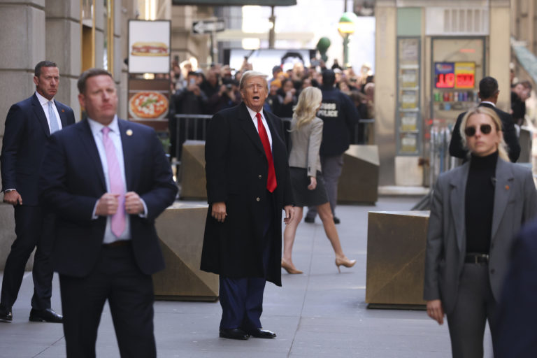 Bývalý prezident Donald Trump komentuje svoj odchod z Wall Street 40 po tlačovej konferencii. Foto: SITA/AP
