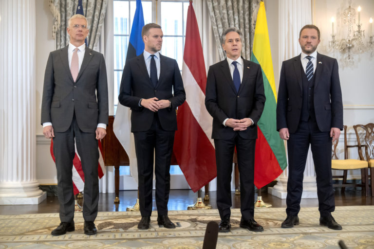 Štátny tajomník Antony Blinken (druhý sprava) a zľava sa nachádzajú: minister zahraničných vecí Lotyšska Krisjanis Karins, minister zahraničných vecí Litvy Gabrielius Landsbergis a minister zahraničných vecí Estónska Margus Tsahkna. Foto: SITA/AP