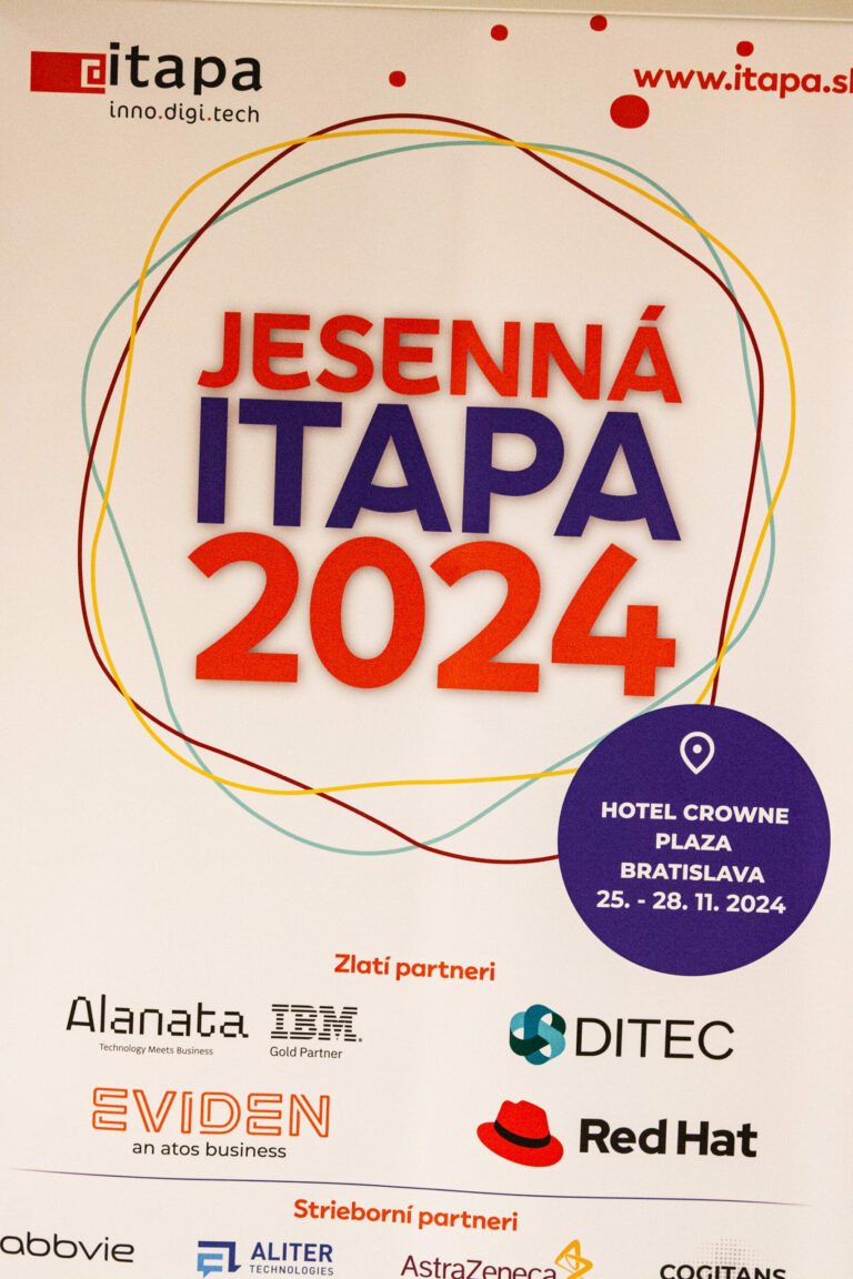 Banner 23. ročníka medzinárodnej konferencie Jesenná ITAPA 2024 v priestoroch hotela Crowne Plaza v Bratislave. Bratislava, 25. november 2024. Foto: SITA/Bokor Tomáš