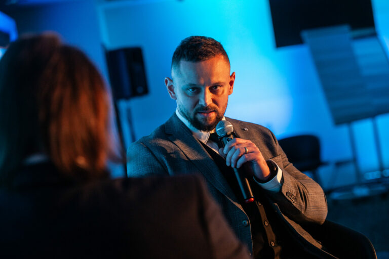 Zľava: Moderátor Šimon Jeseňák a minister zdravotníctva Kamil Šaško počas panelovej diskusie v rámci 23. ročníka medzinárodnej konferencie Jesenná ITAPA 2024 v priestoroch hotela Crowne Plaza v Bratislave. Bratislava, 25. november 2024. Foto: SITA/Bokor Tomáš