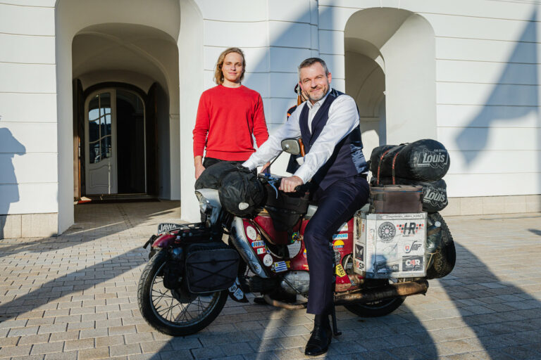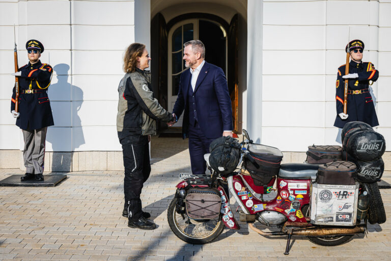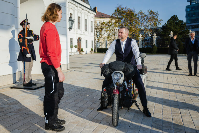 Zľava: Cestovateľ a dobrodruh Ján Drinka a prezident SR Peter Pellegrini počas prijatia v Prezidentskom paláci. Bratislava, 25. november 2024 Foto: SITA/Kancelária prezidenta