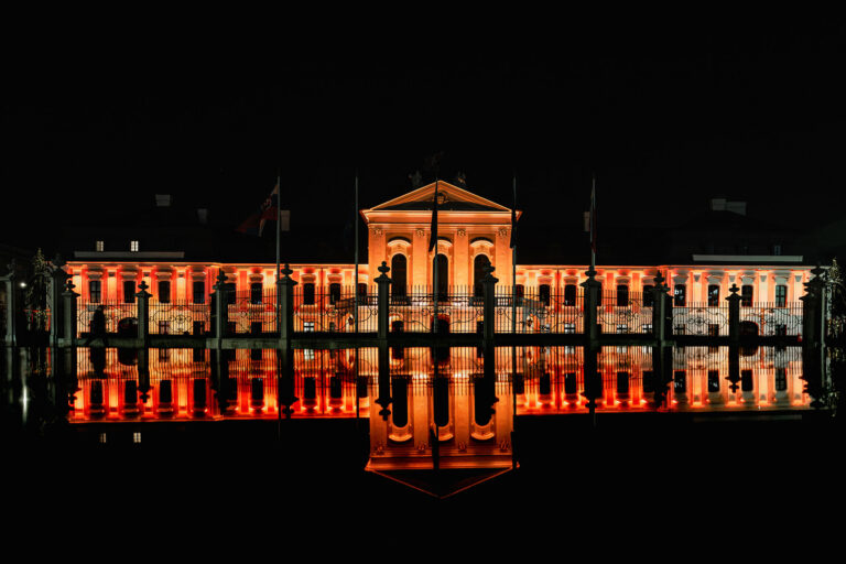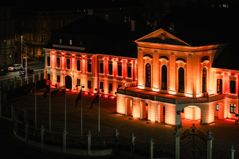 Prezidentský palác vysvietený oranžovou farbou nádeje počas 6. ročníka osvetovej kampane Zastavme násilie na ženách Orange the World, ktorá je súčasťou globálnej iniciatívy OSN pri príležitosti Medzinárodného dňa za odstránenie násilia na ženách. Bratislava, 25. november 2024. Foto: SITA/Kancelária prezidenta SR