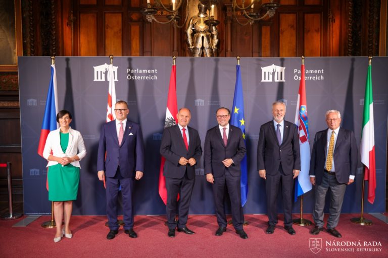 Zľava: Predsedníčka Poslaneckej snemovne Parlamentu Českej republiky Markéta Pekarová Adamová, predseda Národnej rady SR Boris Kollár a predseda rakúskej Národnej rady Wolfgang Sobotka počas neformálneho stretnutia predsedov parlamentov krajín Slavkovského formátu (S3) na rakúskom zámku Grafenegg. Foto: SITA/Kancelária NR SR.