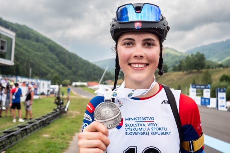 Ema Kapustová zo Slovenska získala striebornú medailu v disciplíne Rýchlostné preteky - juniorky v rámci MS 2023 v letnom biatlone o Pohár Medzinárodnej biatlonovej únie (IBU) v Osrblí. Foto: SITA/Igor Stančík/Slovenský biatlon