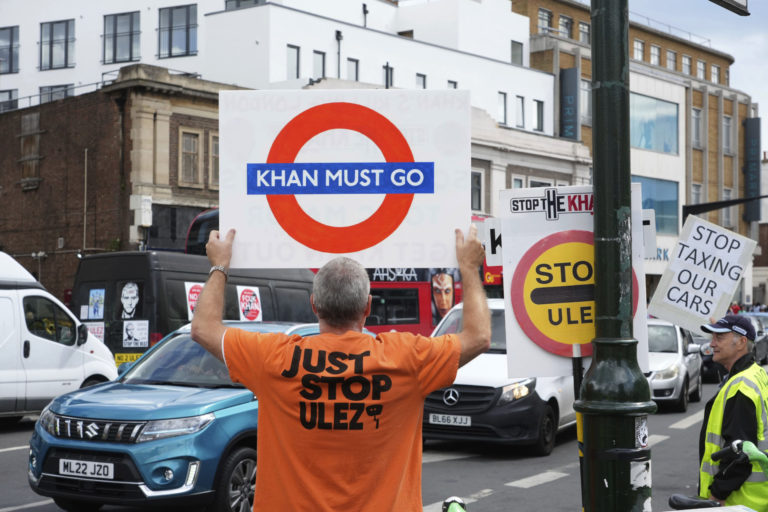 Protest proti plánom londýnskeho starostu Sadiqa Khana, ktorý chce rozšíriť nízkoemisnú zónu na väčšiu časť mesta. Foto: Jeff Moore/PA via AP.