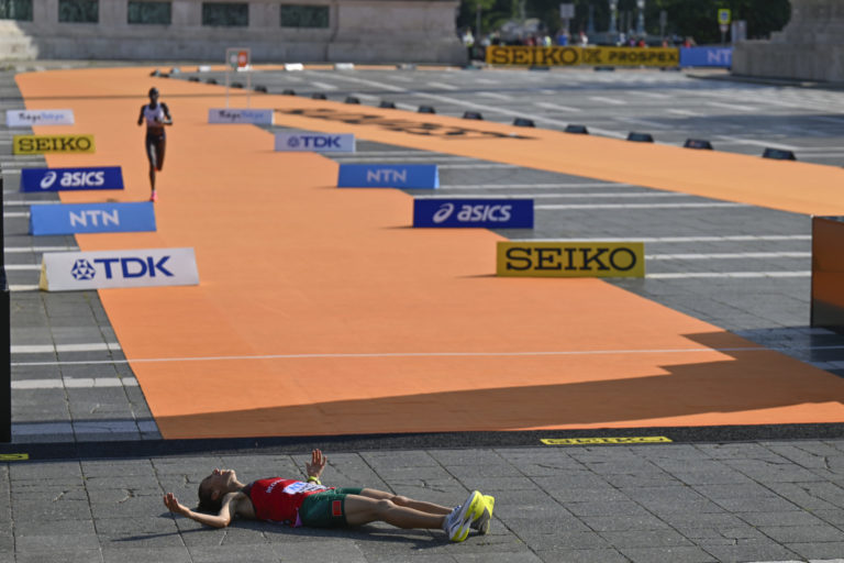 Fatima Ezzahra Gardadiová z Maroka v cieli maratónu na MS v atletike v Budapešti, v ktorom obsadila tretie miesto. Foto: SITA/AP.
