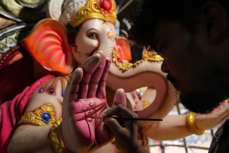 Maľovanie sochy hinduistického boha Ganesha s hlavou slona pred blížiacim sa festivalom v indickom Hyderabáde. Foto: SITA/AP.