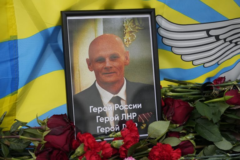 Portrét Jevgenija Prigožina pri vytvorenom pietnom mieste blízko Kremľa v Moskve. Foto: SITA/AP.