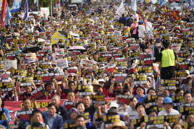 Tisíce ľudí na proteste v Soule žiadali zastavenie vypúšťania rádioaktívnej vody do oceána z elektrárne Fukušima. Foto: SITA/AP.