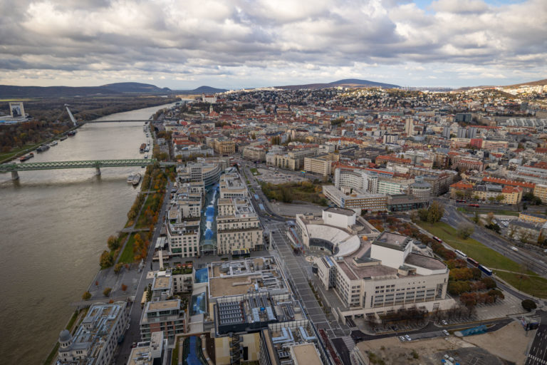 Výhľad z Eurovea Tower počas 1. ročníka behu na najvyššiu budovu Slovenska Eurovea Tower Run. Bratislava, 25. november 2023. Foto: SITA/Jana Birošová