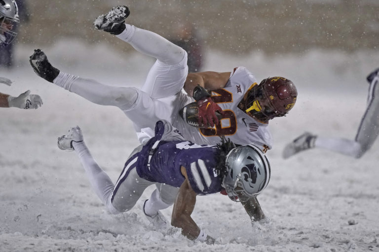 Stevo Klotz z Iowy je zrazený k zemi obrancom Kansasu Willom Lee III. počas druhého polčasu univerzitného futbalového zápasu NCAA. Foto: SITA/AP.